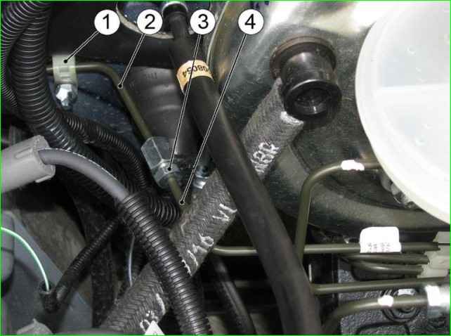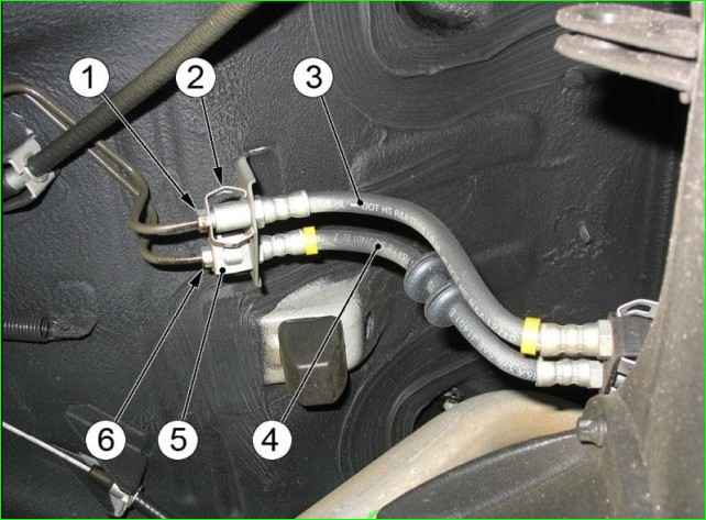 Disconnect the fitting 3 of the pipe to the right front brake 4 and install a plug in its hole