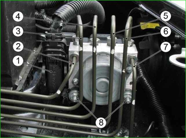 Install the ABS module on the bracket, aligning the grooves on the rubber bushings with the slots on the bracket, and tighten nuts 8 with a torque of 8±2 Nm.
