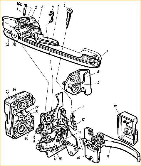 Front right door lock: 1 - external drive lever rod; 2 - key guide; 3 - lock switch lever; 4 - switch rod; 5 - key; 6 - lock release button; 7 - sealing gasket of the outer handle; 8 - lock body; 9 - locking pin; 10 - lining of the inner handle; 11 - shutdown button rod; 12.19 - shutdown levers; 13 - internal drive lever; 14, 26 - internal and external door handles, respectively; 15 - bracket for the internal handle; 16 - internal lock body; 17 - lever of external lock drive; 18 - intermediate lever; 20 - lock drive finger; 21 - dog; 22 - clamp; 23 - external lock cover; 24 - external lock body; 25 - lock switch