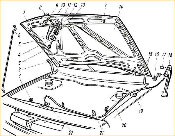 Hood and lock parts: 1 - hood stop bushing; 2 - hood hinge; 3 - pin; 4 - lower cup; 5 - hook; 6 - emphasis; 7 - buffers; 8 - lock washer; 9 - hook spring; 10 - hook axis; 11 - lock nut; 12 - upper cup; 13 - pin spring; 14 - hood; 15 - hood mounting bolts; 16 - rod shell bushing; 17 - handle axis; 18 - lock handle; 19 - lock rod seal; 20 - shell with lock rod; 21 - lock rod holder; 22 - lock spring