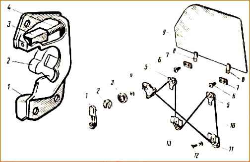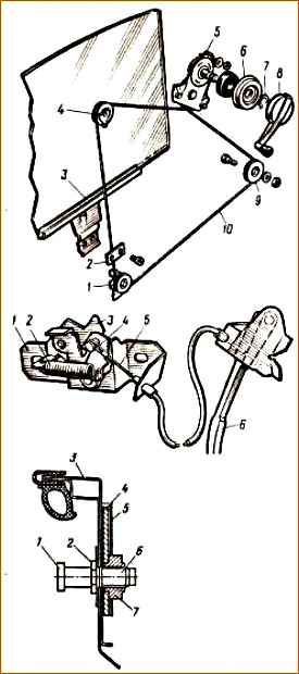 The amount of free play of the sliding glass of the front doors of the VAZ-2105, -2104, -2107 models is adjusted by lowering the glass all the way into the rubber buffer, and handle 1, with the screws 6 of the pressure plates turned out, is turned until the bushing on the front vertical branch of the cable is aligned with the middle of the front bracket 8 and tighten screws 6.