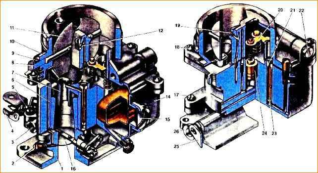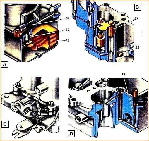In the body of the float chamber there are: two large 6 and two small diffusers 7, two main fuel jets 28, two air brake jets 21 of the main metering systems, two emulsion tubes and, located in wells, fuel 13 and air jets of the idle system , economizer and guide bushing 27, accelerator pump 24 with discharge and check valves.