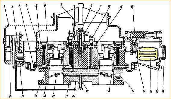 Carburetor K-126: 1 - Mixing chamber; 2 - Mixture quality screw; 3 - Vacuum regulator hole; 4 - Throttle valve drive lever; 5 - Mixture amount screw; 6 - Large diffuser; 7 - Small diffuser; 8 - Air damper axis; 9 - Air damper spring; 10 - Float chamber cover; 11. Air damper; 12 - Acceleration pump nozzle. 13. Idle fuel jet; 14 - Float chamber housing; 15 - Viewing window; 16 - Throttle valve; 17 - Housing fastening screw; 18 - Screw securing the cover; 19 - Economizer sprayer; 20 - Accelerator pump drive. 21 - Main air jet; 22 - Filter plug; 23. Emulsion tube; 24 - Acceleration pump piston; 25 - Drive link; 26 - Secondary throttle valve axis; 27 - Guide sleeve; 28 - Main fuel jet; 29 - Float; 30 - Fuel valve; 31 - Fuel filter