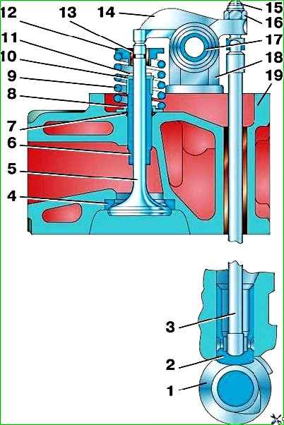 The valves are driven from the camshaft through pushers, pushrods and rocker arms (Fig. 1)