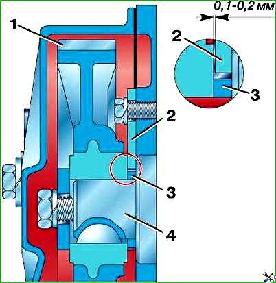 A working gap of 0.1–0.2 mm between the gear hub and the thrust flange is ensured by the fact that the spacer ring 3, sandwiched between the gear and the camshaft journal, is thicker than the thrust flange.