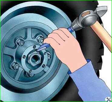 Tighten the hub bearing adjustment nut using a wrench (Fig. 1) and a 300–350 mm long wrench with one hand until the wheel rotates tightly.