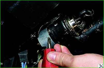 Using a slotted screwdriver, unscrew one screw securing the ignition switch to the steering column bracket on the left and the second, located below, to the right of the first.