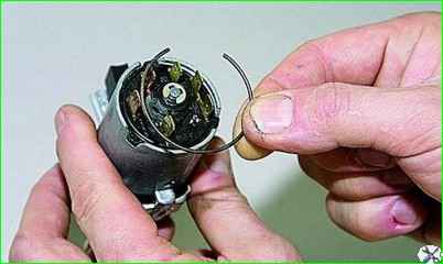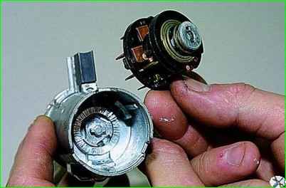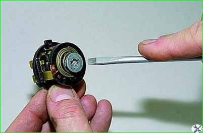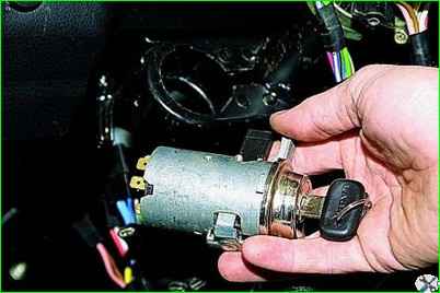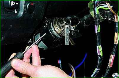 Putting the ignition switch key in position “0” (“off”), use a slotted screwdriver with a narrow blade to push the ignition switch lock through the hole in the side wall of the steering column bracket.