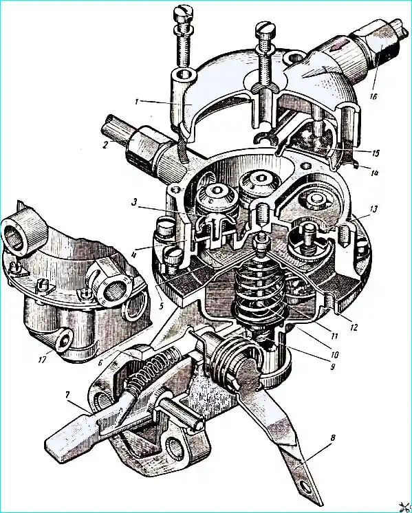 When the diaphragm moves upward, fuel is pumped through the outlet valves 3 into the head cavity, from where it is directed to the fine filter and then to the carburetor: