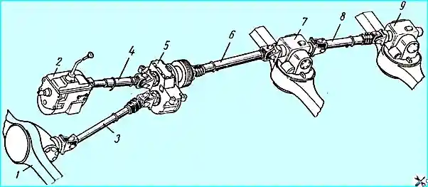 Each cardan shaft consists of a thin-walled pipe, to one end of which a fixed hinge fork is welded, and to the other end a splined sleeve 9, connected to the sliding hinge fork.