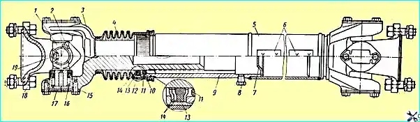 To lubricate, disassemble the splined joints, unscrew the plug 8; wash the splines of the sliding fork and the inner cavity of the splined bushing, put fresh grease into this cavity and reassemble the shaft.