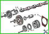 The timing mechanism consists of a camshaft, intake and exhaust valves, as well as parts for their installation and drive: tappets, rods, rocker arms, adjusting screws with nuts, plates with crackers, springs, struts and rocker arm shafts
