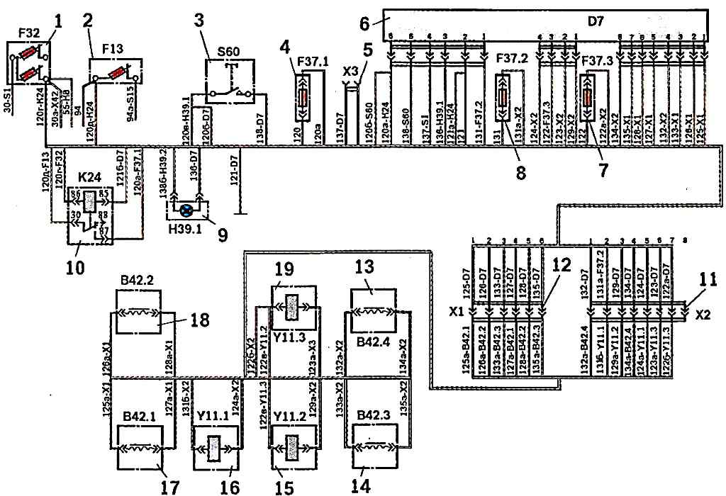 ABS Additional Electrical Equipment Circuit Diagram: 1 - push-button thermal bimetallic fuse 1302.22 for 7.5x2; 2 - push-button thermal bimetallic fuse 10A 29.3722; 3 - control button 11.3704-01; 4 - fuse 164 PR 119 5; 5 - control unit 12.3863; 6 - ABS control unit 112863; 7 and 8 - fuses 6A PR 119-01; 9 - malfunction indicator, ABS PD 20-D; 10 - ABS power relay 111.3747; 11 and 12 - plug connectors; 13 and 14 - wheel sensors of the right and left wheels, respectively, of the rear axle; 15 and 19 - electromagnets of the modulators, respectively, of the left and right wheels of the rear axle; 16 - electromagnet of the wheel modulator of the front axle; 17 and 18 - wheel sensors of the left and right wheels, respectively, of the front axle. Wire color: white - 133,133 A, 135 135 A; blue - 132,132 a, 134,134 a; yellow - 120 d. 131,131 a, 131 b; green - 120 d., 124,124 a, 137; red - 120,120 a, 120 6,120 b, 129,129 a; brown - 126,126 ,128,128 a, 138; orange - 123,123 a; pink - 122,122 a, 122 b,122 b; violet - 125,125 a,127,127 a,136; black - 121,121 a