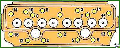 Check the tightening of the cylinder head mounting bolts after the break-in period and every 40 thousand km of run on a warmed-up diesel engine in the following order: