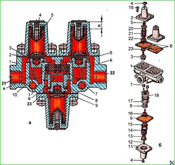 Then unscrew the screws, remove the cover 11 and take out the valve 8 with the spring 14, guide 13, plate 15 and membrane 9.