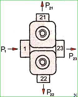 To check the tightness of the triple safety valve, air must be supplied to terminal 1 under a pressure of 0.75 MPa. the pressure in terminals 21, 22 and 23 should become equal to the pressure in terminal 1.