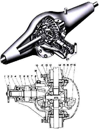 - - introducir las tuercas de ajuste 16 en la parte roscada de la carcasa del eje trasero, lo más cerca posible de los cojinetes, e instalar las tapas 17 según las marcas en las tapas de los cojinetes y en la carcasa del eje trasero;