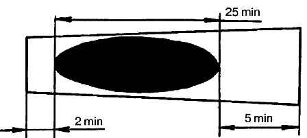 - - en el lado que no trabaja del diente, el parche de contacto se mueve hacia la parte superior del diente y se mueve ligeramente hacia su extremo estrecho.
