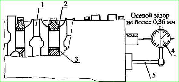 Si el juego axial excede el valor máximo permitido, reemplace las medias arandelas de empuje por otras nuevas y mida el juego axial nuevamente. Si durante la medición resulta ser superior a 0,36 mm, sustituir el cigüeñal.