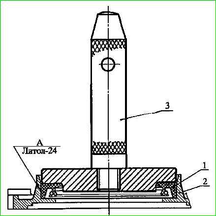 Llene ⅔ de la cavidad entre el borde de trabajo y la funda del manguito de goma con lubricante CIATIM-221, instale y asegure el soporte del sello de aceite con la junta al bloque de cilindros.
