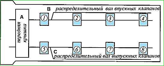 Las tapas de los árboles de levas deben instalarse según su numeración (Fig. nº 5), guiado por salientes redondos con números para el eje de admisión - a la izquierda, escape - a la derecha, visto desde la parte delantera del motor.