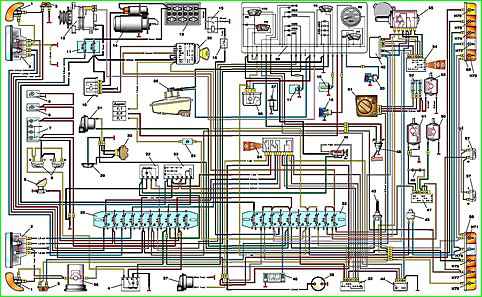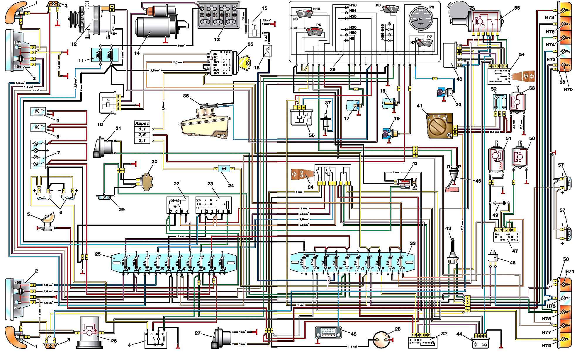 Equipo eléctrico de los vehículos GAZ-3302 y GAZ-2705 con motor y de la familia ZMZ-406: 1 - indicador de dirección; 2 - faro; 3 - repetidor de señal de giro; 4 - interruptor de luces para iluminar los asientos traseros de la cabina (vehículos con dos filas de asientos); 5 - lámpara del compartimento del motor; 6 - luz de cortesía para los asientos traseros de la cabina (para vehículos con dos filas de asientos); 7 - iluminación interior (asientos delanteros) de la cabina; 8, 9 - pantallas de lámpara para iluminar el compartimento de carga (GAZ-2705 con dos filas de asientos); 10 - relé de arranque; 11 - caja de fusibles en el compartimento del motor; 12 - generador; 13 - batería; 14 - motor de arranque; 15 - interruptor de batería; 16 - botón de interruptor remoto de batería; 17 - sensor de la lámpara de advertencia de sobrecalentamiento del refrigerante; 18 - sensor indicador de temperatura del refrigerante; 19 - sensor indicador de presión de aceite; 20 - sensor del testigo de caída de emergencia de la presión del aceite; 21 - bloque de diagnóstico; 22 - interruptor de luces antiniebla (traseras); 23 - interruptor de luz central; 24 - lámpara indicadora de diagnóstico; 25 - bloque de fusibles inferior; 26 - motor del lavaparabrisas; 27 - señal de sonido; 28 - portalámparas portátil; 29 - iluminación del dosel de la plataforma de a bordo (GAZ-33021); 30 - interruptor de señal del conductor; 31 – zumbador de señal del conductor (GAZ-33021); 32 - interruptor de alarma; 33 - bloque de fusibles superior; 34 - interruptor del indicador de dirección; 35 - interruptor de encendido (cerradura); 36 - sensor del testigo de caída de emergencia del nivel del líquido de frenos; 37 - interruptor de la lámpara de advertencia del freno de mano; 38 – disyuntor de la lámpara de advertencia del freno de estacionamiento; 39 - grupo de instrumentos (P3 - tacómetro; P5 - voltímetro; P6 - indicador de temperatura del refrigerante; P7 - indicador de presión de aceite; P8 - indicador de nivel de combustible en el tanque; H7 - luz de advertencia de caída de emergencia de la presión del aceite; H8 - luz de advertencia de sobrecalentamiento del refrigerante; H16 - luz indicadora de intermitentes de dirección; H19 - luz indicadora de reserva mínima de combustible en el tanque; H20 - luz indicadora de luces altas; H54 - luz indicadora de mal funcionamiento del generador; H56 - luz indicadora de caída de emergencia del líquido de frenos nivel; H59 - luz indicadora para encender la luz de posición; N 66-N 69 - lámpara de iluminación del instrumento); 40 - relé de control del limpiaparabrisas; 41 - interruptor del motor del ventilador del calentador; 42 - encendedor de cigarrillos; 43 - interruptor de señal de freno; 44 - interruptor de señal de giro; 45 - interruptor de luz de marcha atrás; 46 - sensor indicador del nivel de combustible en el tanque; 47 - interruptor para el motor eléctrico del calentador adicional y la bomba eléctrica del sistema de calefacción (GAZ-2705 con dos filas de asientos); 48 - receptor de radio; 49 - resistencia del motor eléctrico del calentador adicional (GAZ-2705 con dos filas de asientos); 50 - bomba eléctrica para el sistema de calefacción (GAZ-2705 con dos filas de asientos); 51 - motor eléctrico de un calentador adicional (GAZ-2705 con dos filas de asientos); 52 - resistencia del motor del calentador; 53 - motor eléctrico (ventilador) del calentador; 54 - interruptor del limpiaparabrisas; 55 – motor del limpiaparabrisas; 56 - luz trasera derecha (H70 - lámpara de luz antiniebla; H72 - lámpara de luz de marcha atrás; H74 - lámpara de señal de freno; H76 - lámpara de luz de posición; H78 - lámpara de señal de giro); 57 - luz de matrícula; 58 - luz trasera izquierda (H71 - lámpara de luz antiniebla; H73 - lámpara de luz de marcha atrás; H75 - lámpara de señal de freno; H77 - lámpara de luz de posición; H79 - lámpara de señal de giro); 59 - lámpara de luz antiniebla (GAZ-2705); 60 - bobinas de encendido; 61 - unidad de control de encendido; 62 - sensor de presión absoluta; 63 - sensor de temperatura del refrigerante del sistema de control del motor; 64 - sensor de detonación; 65 - sensor de sincronización; 66 - válvula electromagnética EPHH; 67 - fusible (sistema de encendido); 68 - bujías
