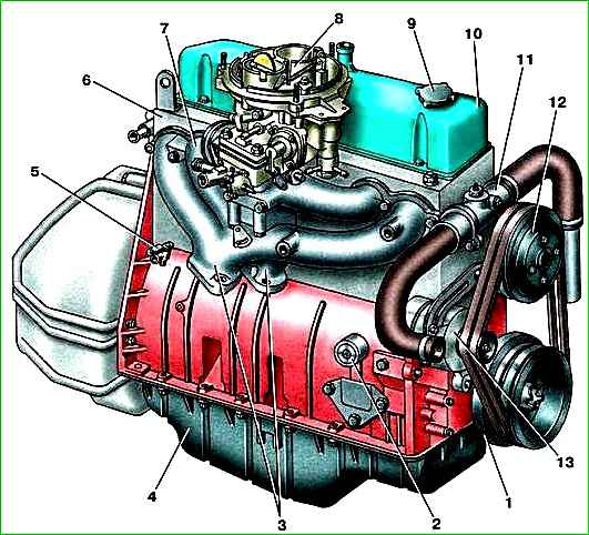 Vista del motor desde el lado derecho: 1 - polea del cigüeñal; 2 - sensor indicador de presión de aceite; 3 - colector de escape; 4 - cárter de aceite; 5 - válvula de drenaje de refrigerante; 6 - culata; 7 - tubo de entrada; 8 - carburador; 9 - tapón de llenado de aceite; 10 - tapa del mecanismo de válvulas; 11 - termostato; 12 - polea de bomba de agua; 13 - generador