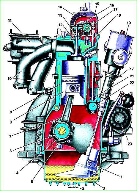 Sección transversal del motor: 1 - bomba de aceite; 2 - cárter de aceite; 3 - tapón de drenaje de aceite; 4 - tapa de biela; 5 - cigüeñal; 6 - tapa del cojinete principal; 7 - biela; 8 - pistón; 9 - camisa de cilindro; 10 - colector de escape; 11 - tubo de entrada; 12 - guía de válvula; 13 - válvula; 14 - purificador de aceite para el sistema de ventilación del cárter; 15 - tapa del eje de la palanca de la válvula; 16 - palanca de válvula; 17 - eje de palanca de válvula; 18 - varilla de empuje; 19 - distribuidor de encendido; 20 - accionamiento del distribuidor de encendido; 21 - empujador; 22 - árbol de levas; 23 - inicial