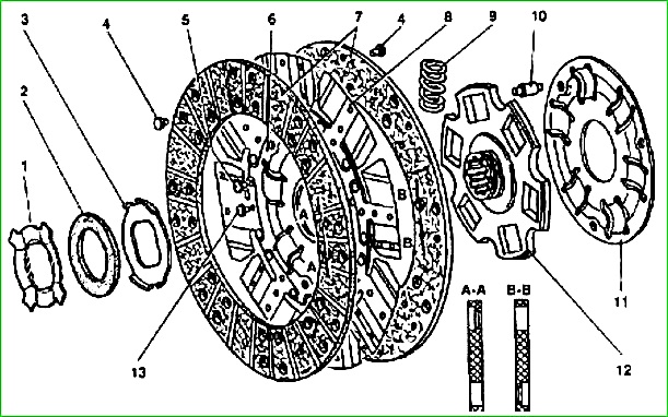 El disco de embrague impulsado está equipado con un amortiguador de vibraciones de torsión por fricción, que consiste en una arandela de fricción de acero 3, asentada en las partes planas del cubo 12 e intercalada entre el disco 6 y la arandela termoaislante 2.