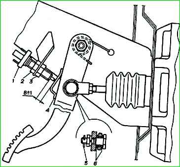 El ajuste de la posición del interruptor de señal de freno 1 (Fig. 1) se realiza estableciendo un espacio (8 ± 1) mm entre el extremo de la parte roscada del interruptor y la almohadilla de empuje 4 del pedal usando nueces 2 y 3.
