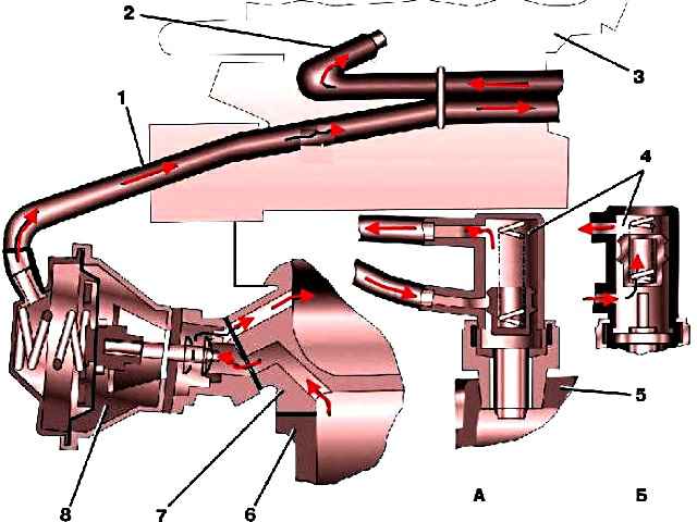 Algunos automóviles están equipados con un sistema de recirculación de gases de escape, que consta de una válvula de recirculación 8 instalada en el gasoducto, un vacuostato térmico 4 atornillado a la camisa de agua de la culata y dos mangueras de conexión.