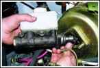 El cilindro de freno principal con un depósito de dos secciones y un sensor de caída de emergencia del nivel del líquido de frenos está acoplado al reforzador de vacío