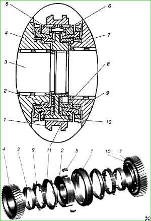 El sincronizador de marchas de 1.ª a 2.ª es de doble cono y tiene un mayor par de frenado debido a la superficie de fricción adicional formada por la superficie cónica exterior del anillo interior 8 conectado al cubo y la superficie cónica interior del anillo central 9. del sincronizador, conectado por tres protuberancias (las protuberancias encajan en los orificios de la corona dentada 10) con la marcha engranada.