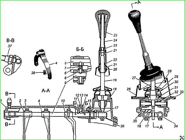 La palanca de cambios está equipada con un dispositivo amortiguador que elimina su ruido durante la resonancia a altas velocidades del motor y está ubicada en una carcasa especial 18, unida al cárter trasero desde arriba.
