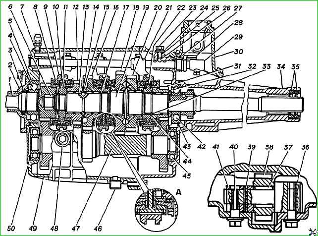 Caja de cambios (sección longitudinal): A - sincronizador de dos conos; 1 - eje de entrada; 2 - tapa del cojinete del eje de entrada; 3 - sello de aceite; 4- rodamiento de bolas del eje de entrada; 5 - anillo de retención; 6 - rodamiento de rodillos del eje secundario; 7 - respiro; 8 - anillo de bloqueo; 9 - embrague de embrague; 10- bloque sincronizador; 11 - cubo de embrague para 3ª, 4ª marcha; 12 - 3ª marcha; 13 - cojinete de agujas del engranaje; 14 - anillo de retención de medias anillas; 15 - medio anillo; 1 6- segunda marcha; 17- anillo de retención; 18 - 1ª marcha; 19 - eje secundario; 20 - marcha atrás; 21 - 5ª marcha y horquilla de marcha atrás; 22 - buje de 5ª marcha y embrague de marcha atrás; 23 - perno que sujeta la placa de retención; 24 - plato; 25 - resorte de sujeción; 26 - bola de abrazaderas; 27- resorte del manguito de bloqueo; 28 - manguito de bloqueo; 29 - cabeza de la 5ª marcha y varilla de marcha atrás; 30 - carcasa de la palanca de cambios; 31 - 5ª marcha; 32 - arandela de empuje; 33- manguito espaciador; 34 - caja de cambios trasera; 35 - sello de aceite; 36 - eje del engranaje intermedio de marcha atrás; 37- cojinete de agujas del engranaje intermedio de marcha atrás; 38 - marcha intermedia de marcha atrás; 39 - pasador; 40 - perno que sujeta el casquillo del eje del engranaje intermedio de marcha atrás; 41 - casquillo para el eje del engranaje intermedio de marcha atrás; 42 - rodamiento de bolas del eje secundario; 43 - anillo de retención del cojinete del eje secundario; 44 - anillo de retención; 45 - rodamiento; 46 - tapón de drenaje de aceite; 47 - bloque de engranajes; 48 - tapón de llenado de aceite; 49 - caja de cambios delantera; 50 - cuñas
