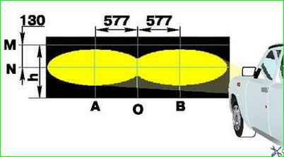 Girando los faros en el soporte, colóquelos de manera que el centro del haz de luz esté en la intersección de las líneas (N) y (A) (B).