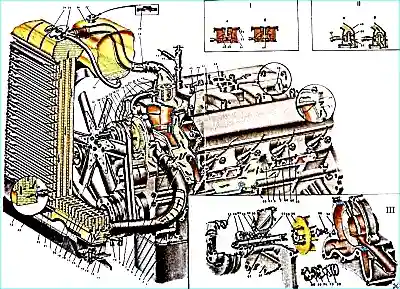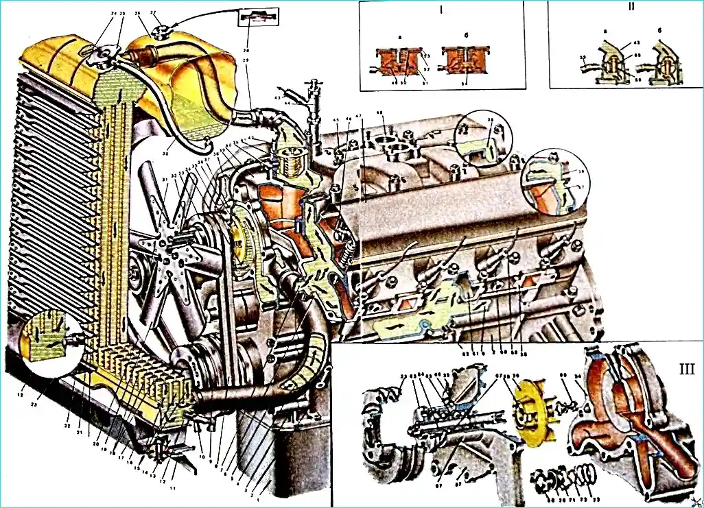 - Cárter de aceite del motor. 2. Bloque de cilindros. 3. Tapa de engranaje de distribución. 4. Resorte de expansión (bastidor de manguera). 5. Manguera de salida del radiador. 6. Camisa de refrigeración del bloque de cilindros. 7. Canal para suministrar refrigerante al bloque. 8. Correas de transmisión del ventilador, bomba de agua y generador. 9. Polea del cigüeñal. 10. Grifo de drenaje del radiador. 11. Soporte de montaje del radiador. 12. Tanque inferior del radiador. 13. Soporte del tanque del radiador. 14. Cojín de suspensión del radiador. 15. Tubo del radiador. 16. Placa del radiador inferior (refuerzo). 17. Guardabarros delantero. 18. Aletas del radiador. 19. Ventilador. 20. Carcasa del ventilador. 21. Placas ciegas del radiador. 22. Placa ciega inferior. 23. Manguera de drenaje del líquido del calentador. 24. Sensor de la lámpara de control de sobrecalentamiento del líquido en el radiador. 25. Tapón del radiador. 26. Tanque de expansión. 27. Tapón del depósito de expansión. 28. Válvula de tapa del tanque de expansión. 29. Tubería de alimentación del radiador. 30. Manguera de conexión del cuello del radiador al tanque de expansión. 31. Generador. 32. Anillo espaciador del ventilador. 33. Polea del ventilador. 34. Toma de bomba de agua en la tapa de distribución. 35. Engrasador de bomba de agua. 36. Impulsor de la bomba de agua. 37. Carcasa de la bomba de agua. 38. Camisa de refrigeración del tubo de admisión. 39. Manguera de derivación para círculo pequeño de circulación de refrigerante. 40. Tubo de entrada. 41. Termostato. 42. Tubo de salida. 43. Manguera para suministrar líquido caliente al calentador. 44. Válvula de cierre del calentador. 45. Sensor del indicador de temperatura del refrigerante. 46. Eje del balancín de la válvula. 47. Tapas de balancines. 48. Brida para carburador. 49. Válvula de tapón de escape. 50. Resorte de tapón de corcho. 51. Cuello de llenado del radiador. 52. Junta de estanqueidad. 53. Cuerpo de la tapa del tapón. 54. Válvula de tapón de entrada. 55. Válvula termostato. 56. Sensor del termostato. 57. Camisa de refrigeración de culata. 58. Culata. 59. Cable de alto voltaje. 60. Bujía. 61. Canal de escape de culata. 62. Arranque de la tubería de alimentación del calentador. 63. Cubo de la polea del ventilador. 64. Bomba de agua de rodillos. 65. Manguito de expansión. 66. Orificio de control para salida de lubricante. 67. Cojinetes de bomba de agua. 68. Arandela de sellado de la bomba de agua. 69. Perno de montaje del impulsor. 70. Puño de sellado. 71. Sello de pared. 72. Anillo de sellado. 73. Sello de resorte.