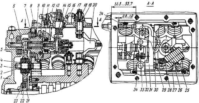 Regulador de velocidad de rotación: 1 - tapa trasera; 2 - nuez; 3 - lavadora; 4 - rodamiento; 5 - junta de ajuste; 6 - marcha intermedia; 7 - junta de la tapa trasera del regulador; 8 - anillo de retención; 9 - porta pesas; 10 - eje de carga; 11 - cojinete de empuje; 12 - acoplamiento; 13 - carga; 14 - dedo; 15 - corrector; 16 - resorte de retorno de la palanca de tope; 17-perno; 18 - casquillo; 19 - anillo; 20 - palanca de resorte del regulador; 21 - engranaje impulsor; 22 - bloque de engranajes impulsores; 23 - brida del engranaje impulsor; 24 - perno de ajuste del suministro de combustible; 25 - palanca de resorte de arranque; 26 - resorte regulador: 27 - cremallera; 28 - primavera inicial; 29 - pasador; 30 - palanca de cremallera; 31 - palanca reguladora; 32 - palanca del embrague de carga; 33 - eje de las palancas reguladoras; 34 - perno que sujeta la tapa superior