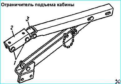 Levantamos la cabina, insertamos los pasadores 1 (Fig. 4) del soporte superior 2 y la prolongación 3 del limitador de elevación a Abins, te vamos a pinchar los dedos