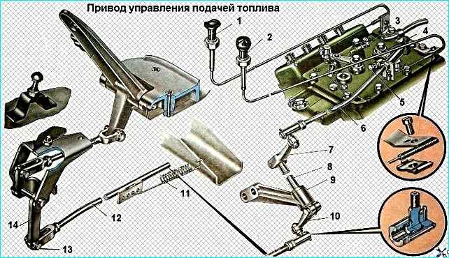 Desenganchamos el pasador 13 de la varilla de control de alimentación intermedia de combustible, retiramos el pasador y desconectamos la varilla 12 de la palanca de doble brazo 14 del acelerador