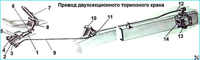 Desenganchamos el pasador 2 de la varilla de mando de la válvula de freno, retiramos el pasador y desconectamos la varilla 9 del accionamiento de la palanca intermedia 4