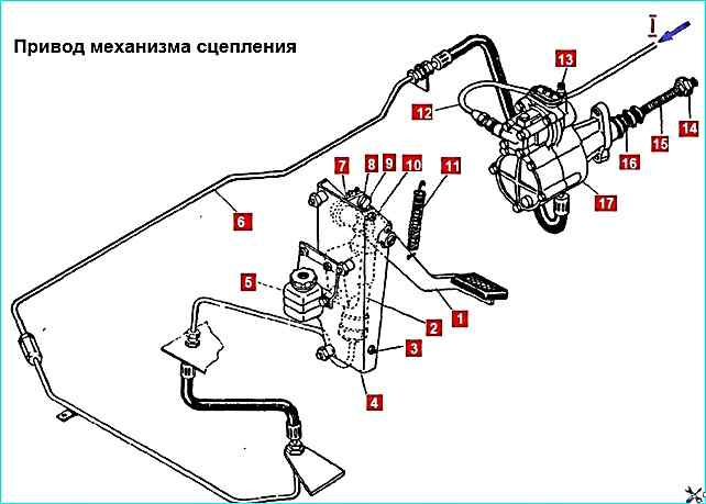 Desconecte la línea hidráulica 6 y drene el líquido del accionamiento hidráulico del embrague