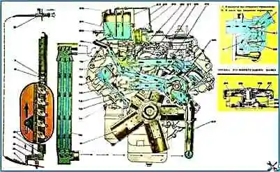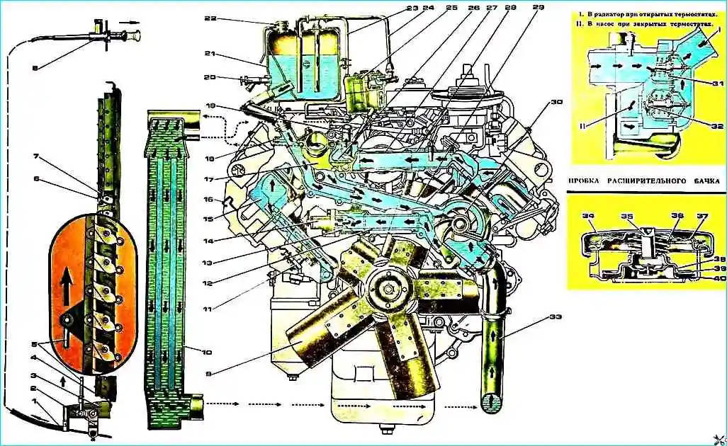Diagrama del sistema de enfriamiento del motor: 1 - Tubo protector, 2 - Palanca de accionamiento del freno, 3 - Soporte de montaje del accionamiento del freno, 4 - Marco tensor del freno del radiador, 5 - Correa del freno, 6 - Placas del freno del radiador, 7 - Varilla de accionamiento de la rejilla de ventilación, 8 - Varilla de control de persiana del radiador, 9 - Impulsor del ventilador, 10 - Radiador, 11 - Grifo de drenaje del sistema de enfriamiento; 12 - Tubería de alimentación del semibloque derecho; 13 - Ramal de tubería de suministro; 14 - Interruptor de embrague hidráulico de accionamiento del ventilador; 15 - Culata; 16 - Manija de la válvula de drenaje; 17 - Caja del termostato; 18. Tubo de drenaje de refrigerante desde el tanque de expansión hasta la bomba de agua; 19 - Tubo de salida de refrigerante al calentador; 20 - Válvula de control de nivel de refrigerante; 21- Tanque de expansión; 22 - Bloqueo de vapor; 23 - Tubo bypass del radiador al depósito de expansión; 24 - Tubo de conexión del compresor al depósito de expansión; 25. Compresor; 26 - Tubo colector de agua derecho; 27 - Conexión de tubería de agua; 28 - Tubo colector de agua izquierdo; 29 - Tubería de derivación de termostatos; 30 - Bomba de agua; 31, 32 - Válvulas termostáticas; 33 - Codo del tubo de salida; 34 - Cuerpo del enchufe; 35 - Soporte de válvula; 36 - Primavera; 37 - Resorte de tapa; 38 - Válvula de escape (58-80 kPa) (0,58-0,8 kgf/cm 2); 39 - Válvula de escape; 40 - Junta