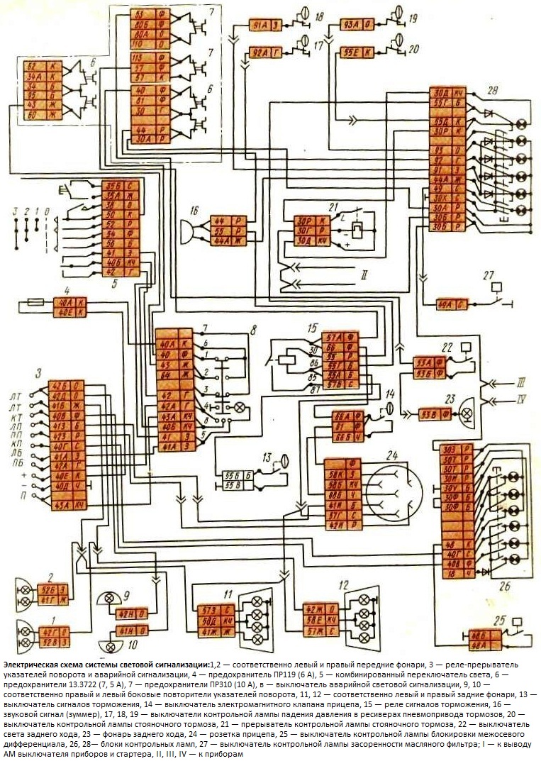 El sistema de señalización luminosa incluye señalización de luces de emergencia, señalización de frenos, indicadores de dirección y lámparas de control para encender los indicadores de dirección del automóvil y remolque, lámparas de control para bloquear el diferencial central, freno de estacionamiento, caídas de presión de aire en los circuitos de el actuador de freno neumático, combinado en bloques de lámparas de control, así como los interruptores, disyuntores y relés correspondientes.