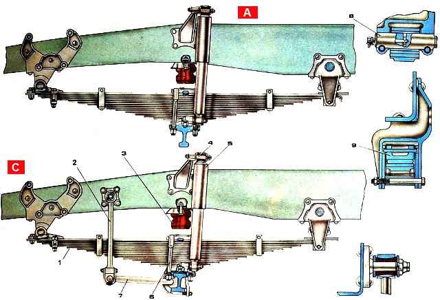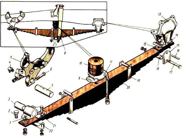 En la parte media del resorte hay una almohadilla 9, a través de la cual el resorte se fija al eje delantero con dos escaleras de tijera 11. La superposición tiene un estampado que encaja en el hueco de la primera hoja.