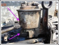 La bomba de dirección asistida con depósito de aceite está instalada en la curvatura del bloque de cilindros y es accionada por el cigüeñal del motor