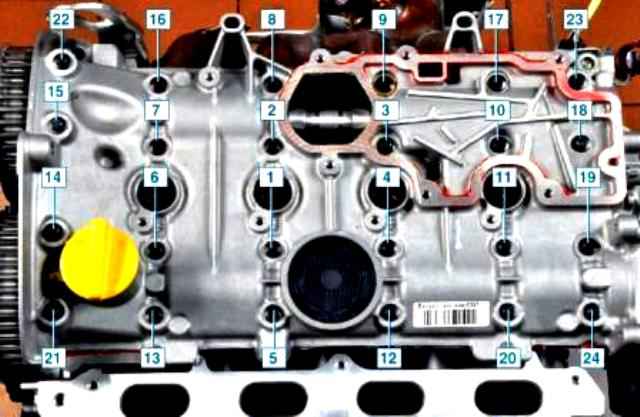 - Apriete los tornillos del primero al 12, del decimocuarto al 19, 21 y 24 - un par de apriete de 15 Nm (1,5 kgf.m);