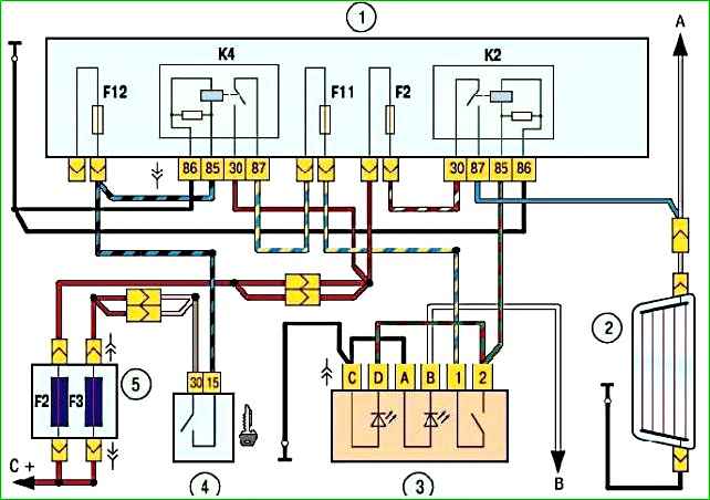 Para hacer esto, se suministra energía al interruptor 3 a través de un relé adicional (relé de encendido) K4, que se activa cuando se enciende el encendido, y el fusible F11.