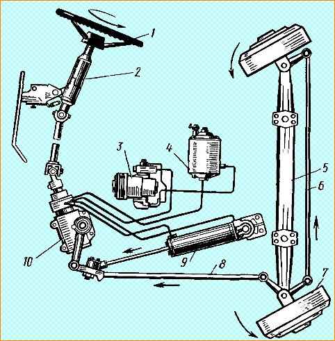 Diagrama de distribución de la dirección: 1 - volante; 2 - columna de dirección; 3 - bomba; 4 tanques de aceite; 5 - viga del eje delantero; 6 - barra de dirección transversal; 7 tambor de freno; 8 - barra de dirección longitudinal; 9 - cilindro de potencia del servomotor hidráulico; 10 - mecanismo de dirección