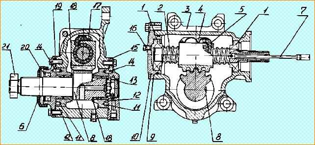 Mecanismo de dirección: 1 - cojinetes; 2 - tornillo; 3 - cuerpo; 4 - estante para nueces; 5 - bolas; 6 - sello; 7 - barra de torsión: 8 - sector de engranajes; 9 - cuñas de ajuste; 10 - tapa; 11 - hoyos; 12 - cojinetes excéntricos, 13 - cojinete liso; 14 - pasador; 15 - tapa de la válvula limitadora de presión); 16 – enchufe; 17 - abrazadera; 18 - anillo de empuje; 19 - tapa; 20 - puño 21 - tuerca